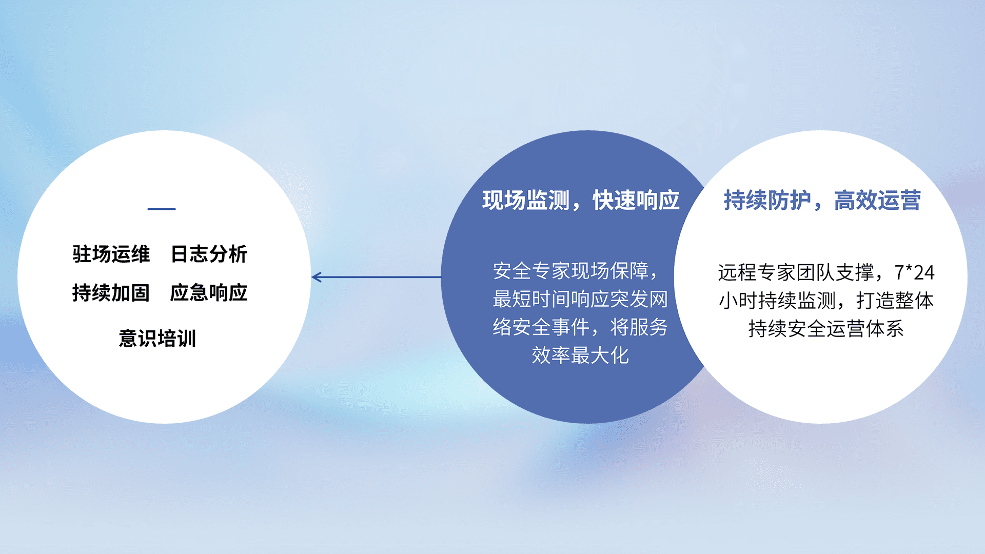 7X24小时持续监测安全事件,保持安全策略有效性,降低资产脆弱性风险,,精准拦截黑客攻击,,减少被黑客利用的机会,,,,第一时间遏制,,,降低损失。。