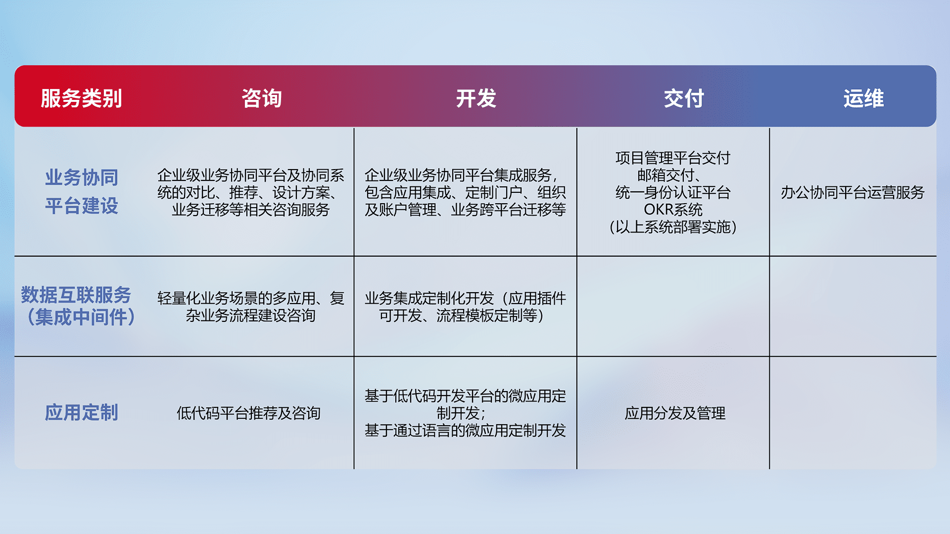 针对钉钉、、、、企微、、、IDaas等平台级产品提供产品的规划、、、方案、、交付、、、定制化开发等服务,,实现如统一协同办公、、、智能客户服务、、、、混合会议管理、、智能数据查询、、等业务场景,,实现数字化转型。。。。